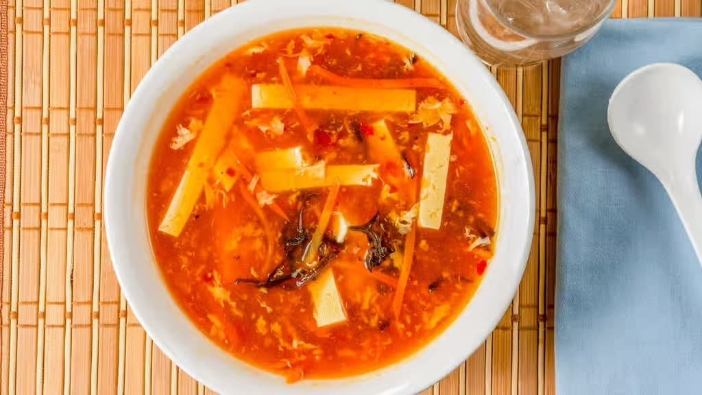 Tofu strips, bamboo shoots, mushrooms, and egg in a tangy and spicy broth.