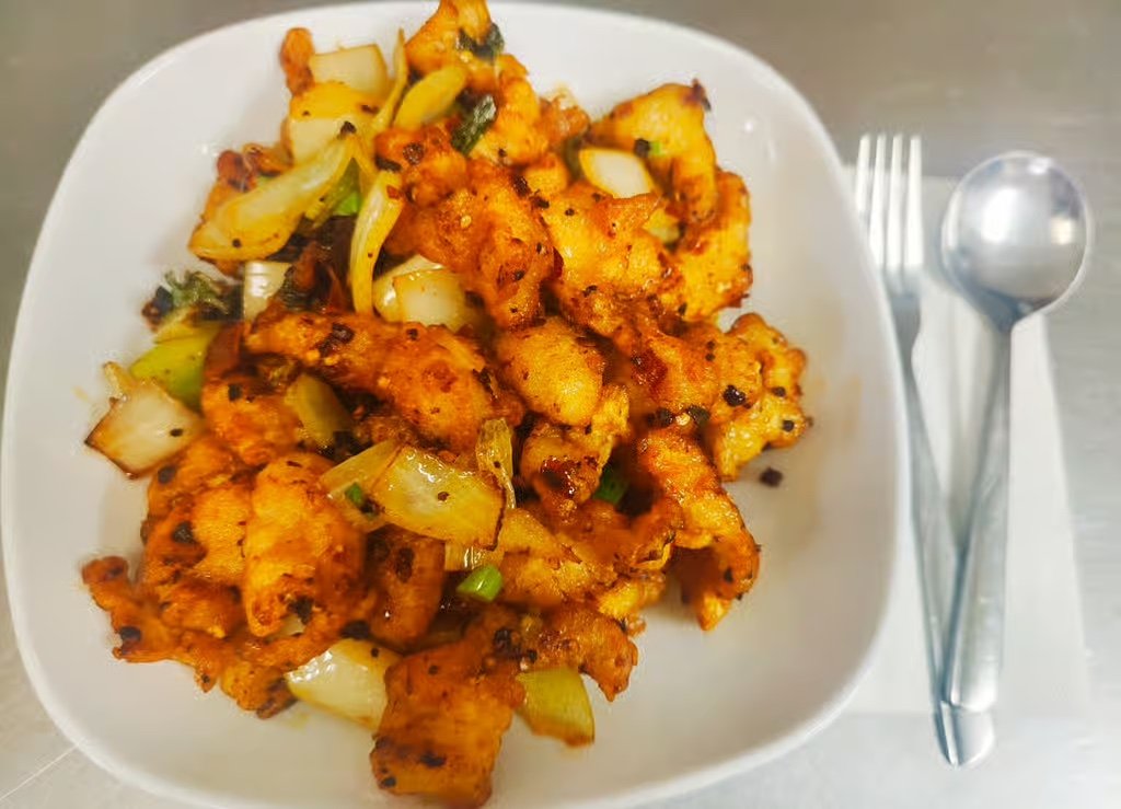 Chicken cubes, chili peppers, green peppers, onions, soy sauce
