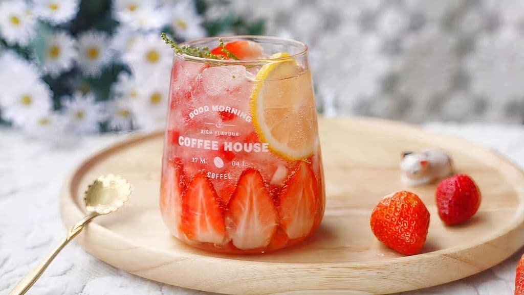 Iced Sprite, strawberry, green lemon, Yakult, sweet and sour taste, a great way to relieve the heat