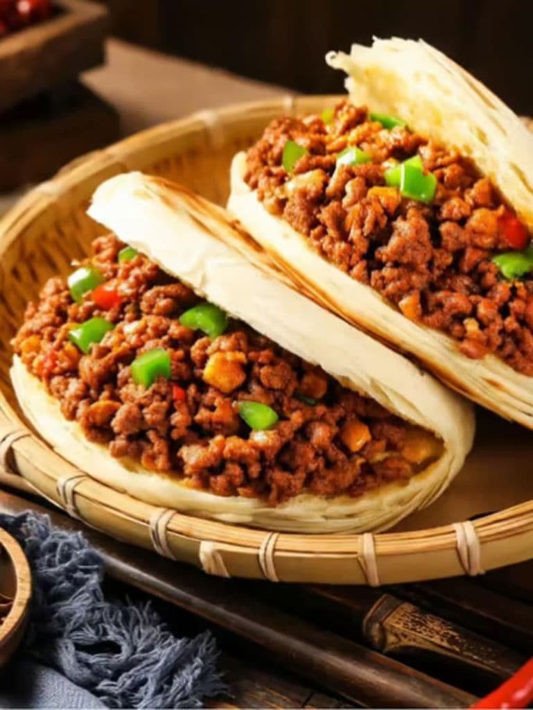 Flaky bread filled with seasoned minced pork, green bell peppers, and spices.